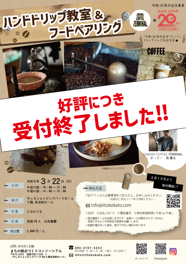2026年2月28日 / 最終更新日時 : 2026年2月28日 consortium お知らせ 『ハンドドリップ教室&フードペアリング』受付終了‼ 『ハンドドリップ教室&フードペアリング』は、好評につき、全ての部において、受付を終了しました。ご応募あありがとうございました。 コメントを残す コメントをキャンセルメールアドレスが公開されることはありません。 ※ が付いている欄は必須項目ですコメント ※ 名前 ※ メール ※ サイト 次回のコメントで使用するためブラウザーに自分の名前、メールアドレス、サイトを保存する。