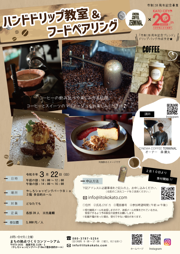 【2/10より受付開始‼】『市制20周年記念事業 ハンドドリップ教室&フードペアリング』参加者募集♪